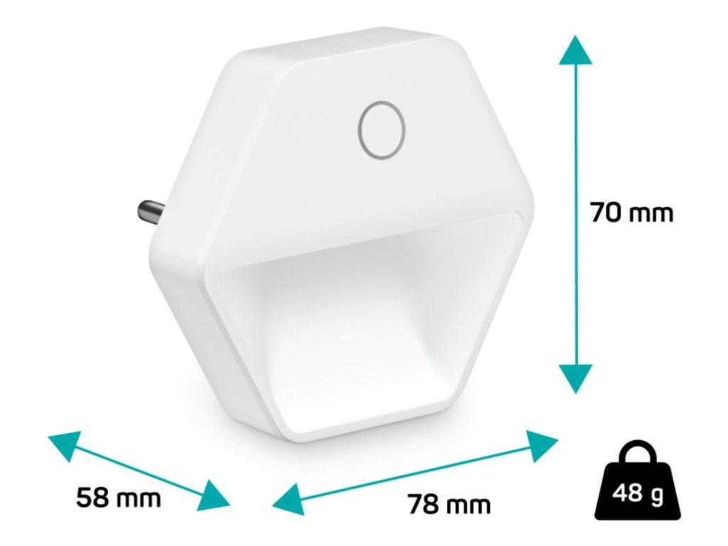 Světlo disponuje touch tlačítkem, které umožňuje zapnout/vypnout světlo a nastavit jas světla ve 3 úrovních. Světlo stačí jednoduše zapojit do libovolné zásuvky a při příkonu 0,60 W se nemusíte bát spotřeby elektrické energie. LED zdroj světla disponuje světelným tokem 30 lumenů.