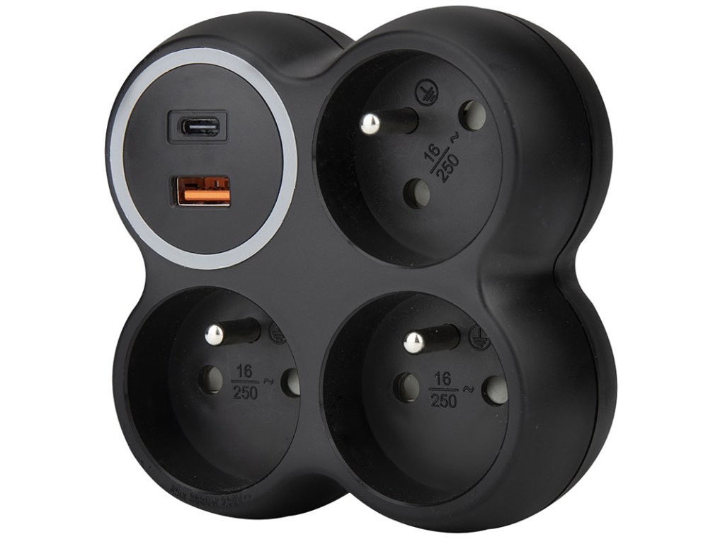 Solight rozbočka, 3x 15A, USB A+C rychlonabíječka 20W PD, matná černá