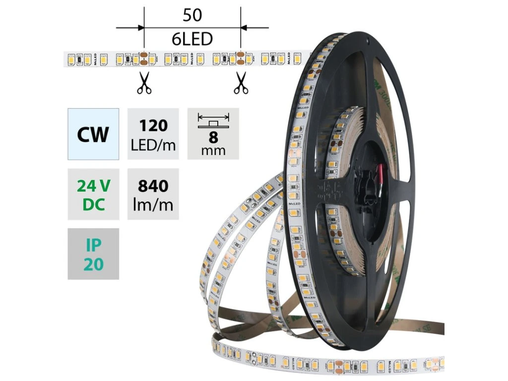 MCLED Pásek LED SMD2835 CW, 120LED/m, 9,6W/m, DC 24V, 840lm/m, CRI90, IP20, 8mm, 5m