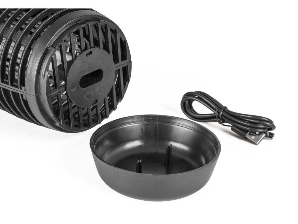 Lapač má háček na zavěšení, takže ho můžete upevnit pod střechu altánu, na větev stromu nebo stanovou konstrukci. Ovládáte ho jednoduše pomocí tlačítka ON/OFF. Sběrnou misku navíc snadno odšroubujete a vyčistíte.