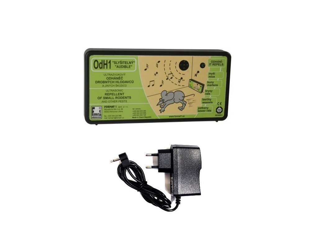 Odpuzovač myší a kun FORMAT OdH1 slyšitelný, sada plašič + adaptérZvukově-ultrazvukový elektronický odháněč myší, kun, krys, lasiček a potkanů.
