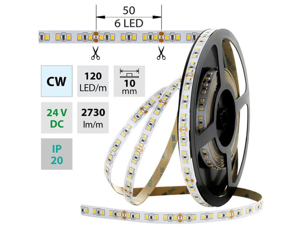 MCLED Pásek LED SMD2835 CW, 120LED/m, 28,8W/m, 2653lm/m, IP20, DC 24V, 10mm, 5m