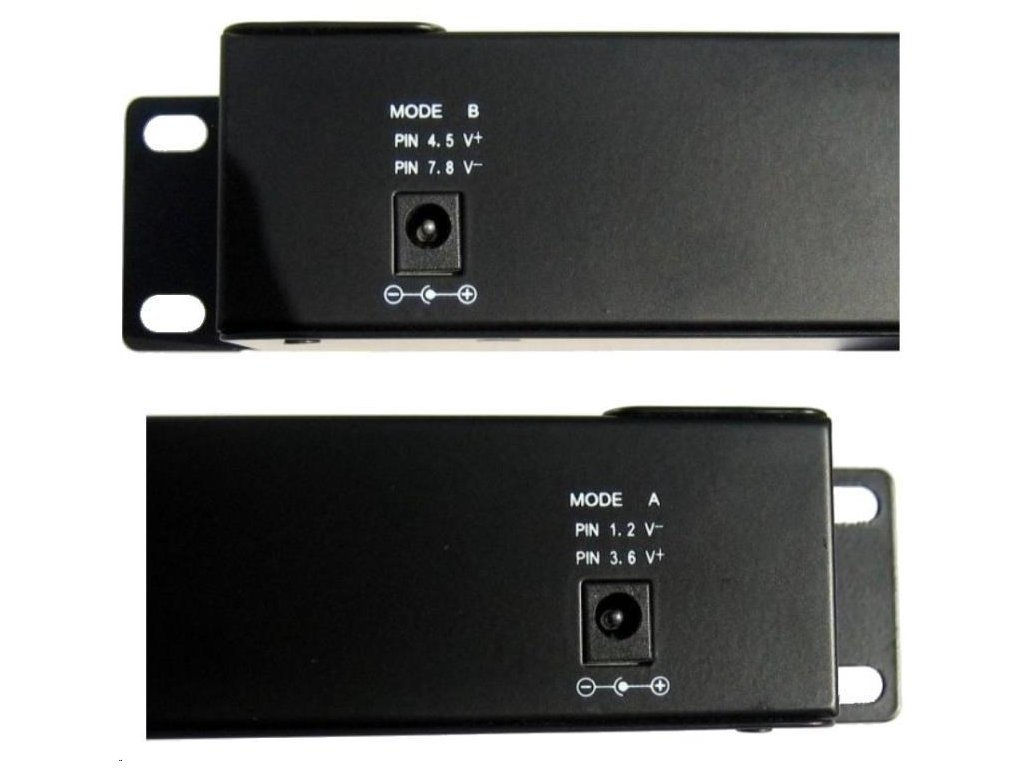 Vstup pro napájení prostřednictvím dvou 2.1mm 60V jacků, z obou vstupů je vždy zároveň napájeno všech 12 portů v režimu dle zvoleného A/B vstupu:
