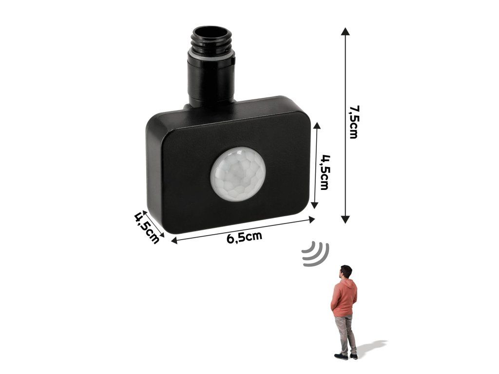 Funkce pohybového senzoru: nastavení soumrakového senzoru LUX 5-2000, nastavení doby svícení 20sec/3min, nastavení dosahu senzoru 1-10m (vzdálenost závisí na pracovních podmínkách), úhel detekce 180°