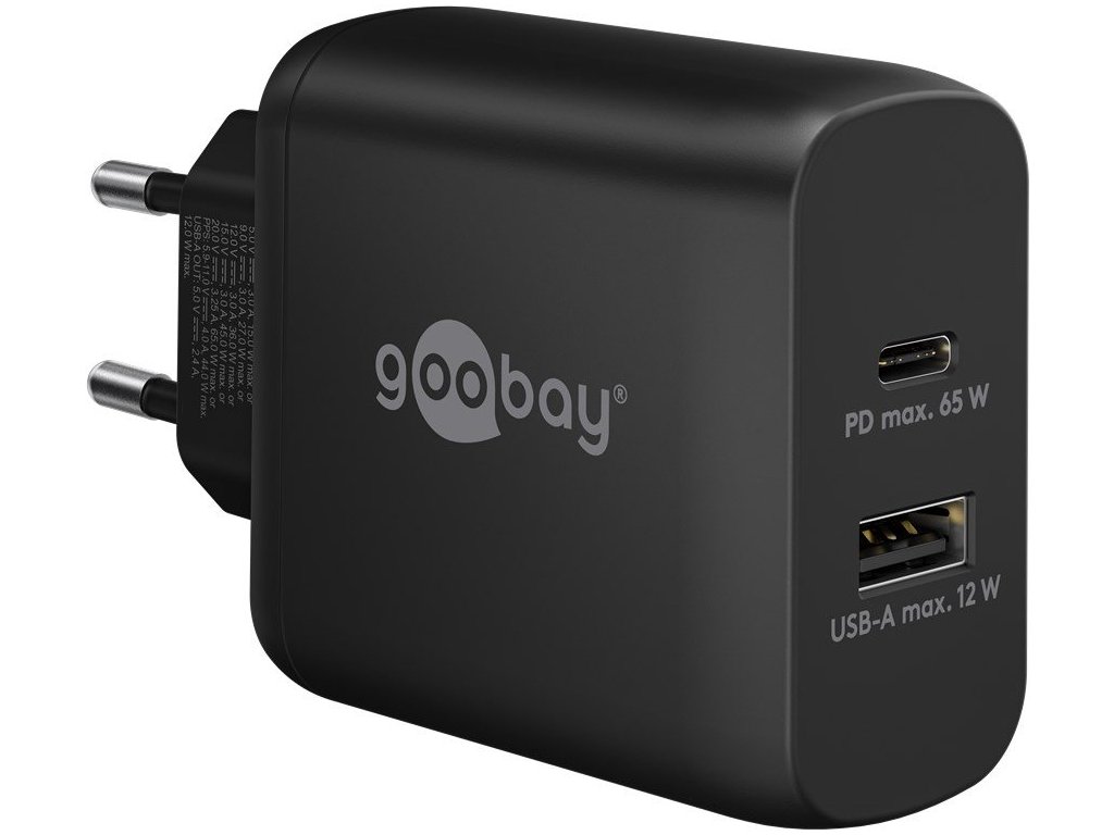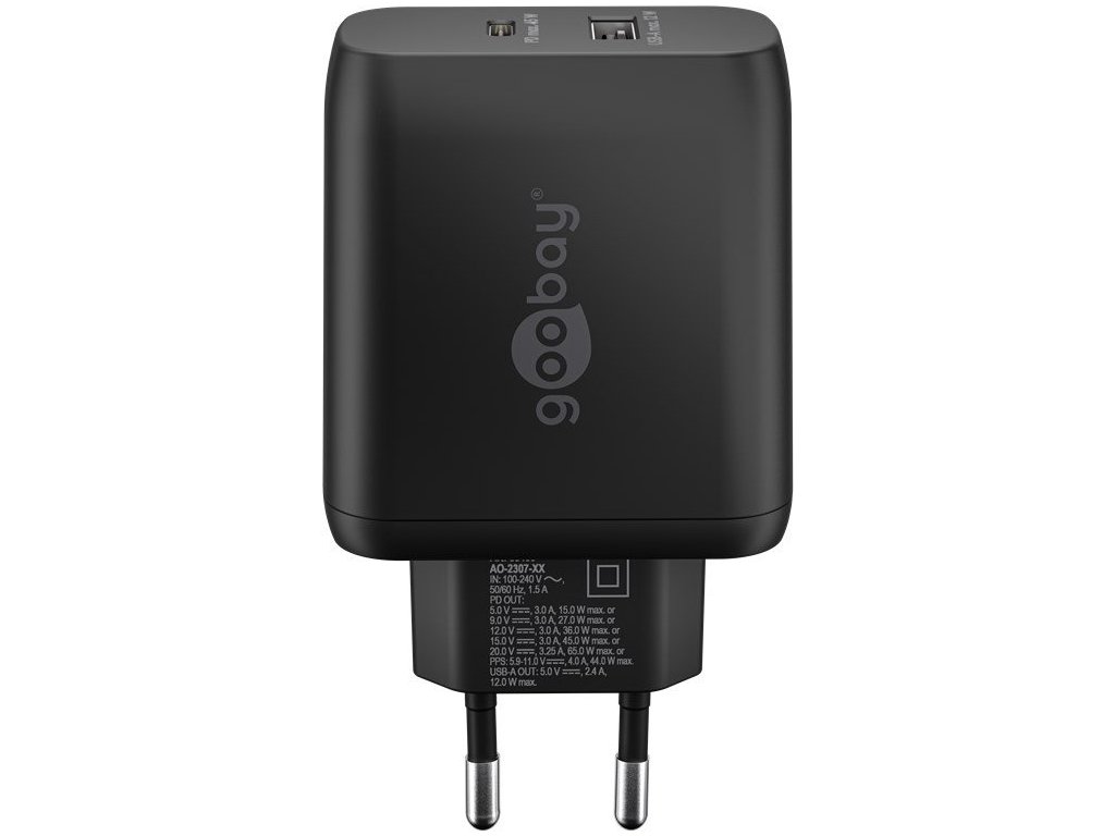Adaptér 230V na 1x USB-C a 1x USB-A PD 65W, černý