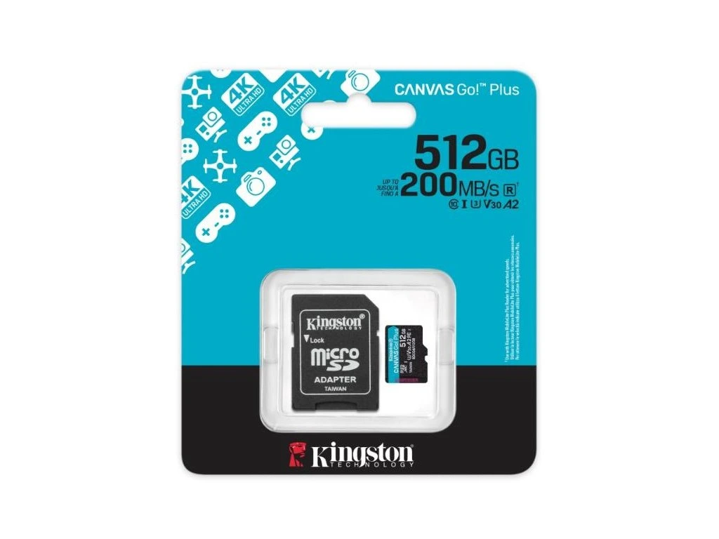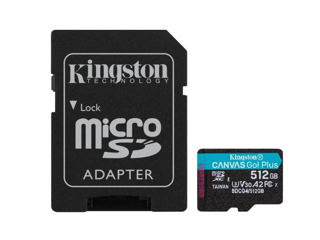 Kingston MicroSDXC karta 512GB Canvas Go! Plus, R:200/W:160MB/s, Class 10, UHS-I, U3, V30, A2 + Adaptér