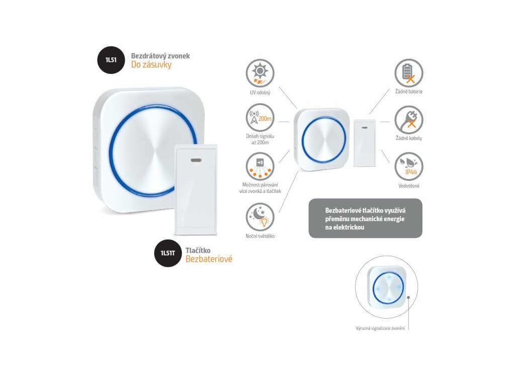 Solight bezdrátový zvonek bezbateriový, do zásuvky, 150m, bílý, learning code