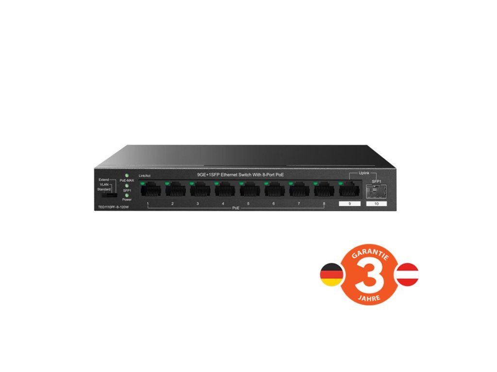 Tenda TEG1110PF-8-120W PoE+ AT switch 8xPoE 802.3af/at + Uplink RJ45 + SFP port, 110W, PoE+, fanless